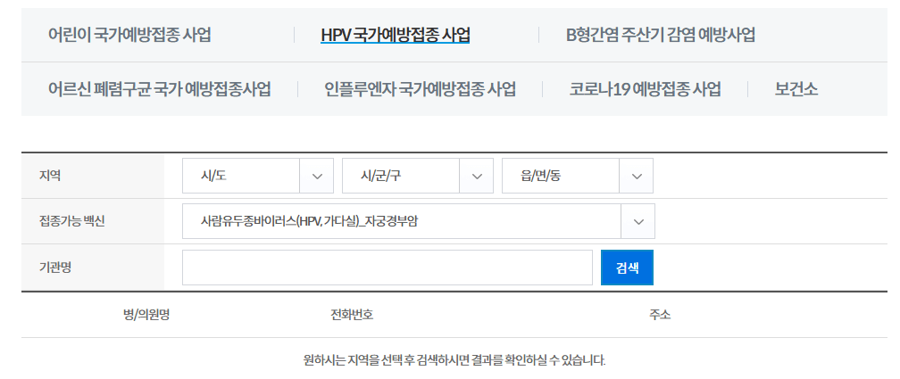 병원마다 취급하는 백신이 달라서 반드시 방문 전에 가다실 9가 예방접종 여부를 확인해야 합니다. 질병관리청 사이트를 통해 내 주변 병원 중 예방 접종이 가능한 병원을 조회할 수 있습니다. 정부에서 운영하는 질병관리청에서 접종 가능한 병/의원명, 전화번호, 주소까지 확인할 수 있습니다.