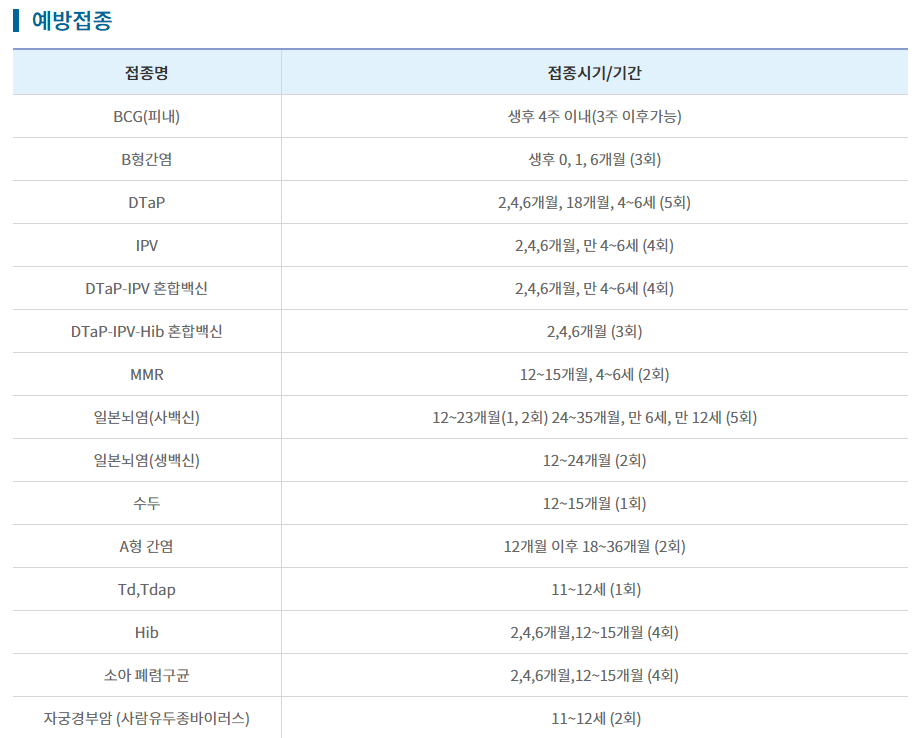 | 백신 종류 | 첫 접종 나이 | 접종 횟수 | 접종 주기 | 예시 |