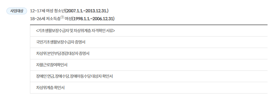 - 18세~26세 저소득층 여성(1998.1.1~2006.12.31)