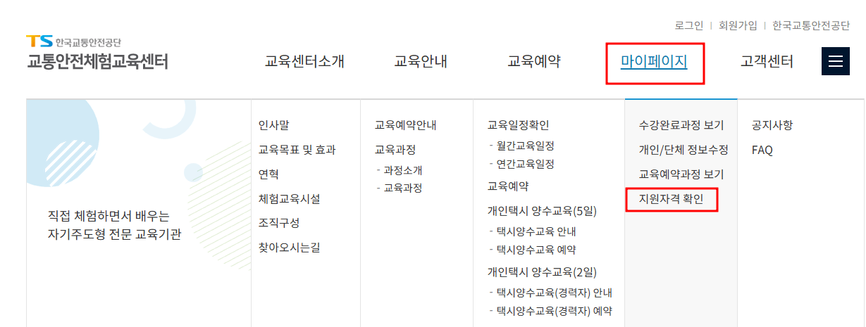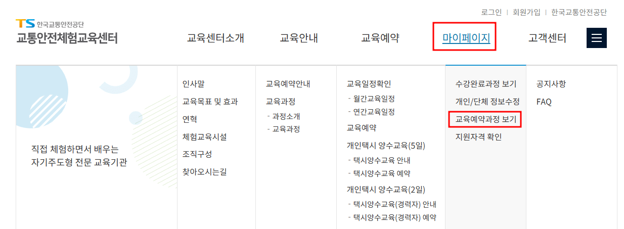 2. 메뉴에서 '마이페이지' -> '교육예약과정 보기' 클릭하기