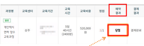 교육이 접수되고 나면 추첨일에 문자로 당첨여부를 안내받거나 홈페이지에서도 확인할 수 있습니다.
