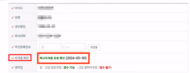 11. '자격증 확인'에 '택시자격증 유효확인'이라는 문구를 확인합니다.