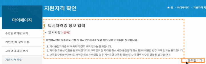 6. '택시자격증 정보 입력 유의사항'을 확인하고 동의에 체크합니다.