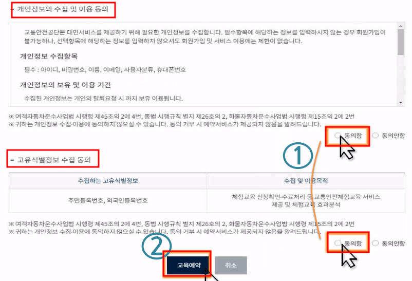 7. '개인정보 수집 및 이용', '고유식별번호 수집', '개인정보 제3자 제공 동의'에 '동의함'을 체크합니다.
