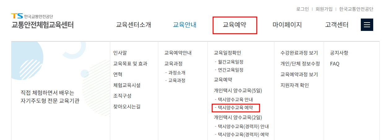2. 상단 메뉴에서 '교육예약' -> '택시양수교육 예약'을 클릭합니다.