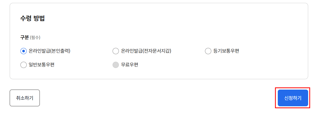 6. 수령방법 선택 후 신청하기를 눌러줍니다.