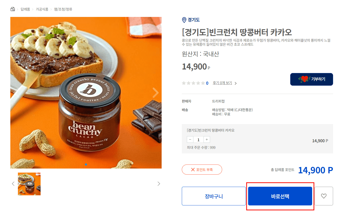 선택한 답례품의 상세 페이지에서 '바로선택' 버튼을 클릭합니다. 이후 배송지 정보를 입력하고, 결제 방법을 선택합니다. 포인트가 충분하다면 포인트로 결제할 수 있으며, 부족한 경우에는 추가 결제를 통해 주문을 완료할 수 있습니다.