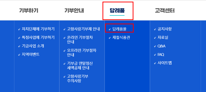 로그인 후, 메인 화면에서 '답례품' 버튼을 클릭한 후 '답례품몰'을 선택합니다.