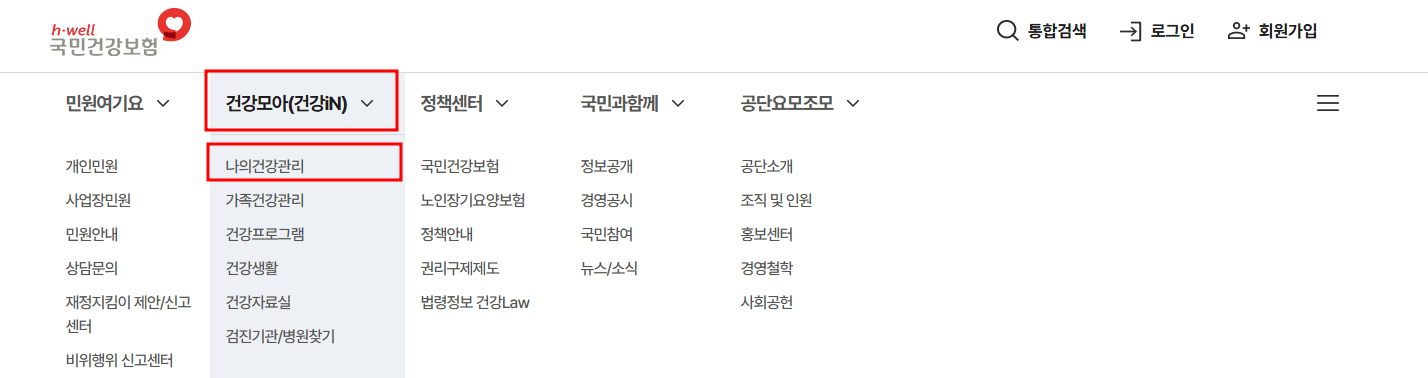 3. 메뉴에서 '건강iN' -> '나의 건강관리'를 클릭합니다.