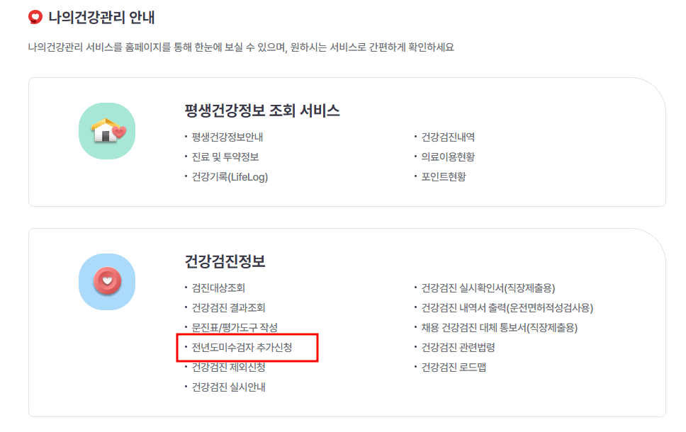 2. '건강검진' -> '건강검진 전년도 미수검자 검진 신청'을 눌러줍니다.