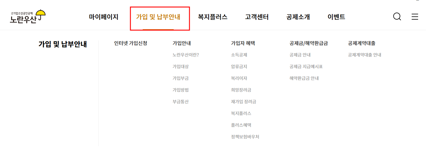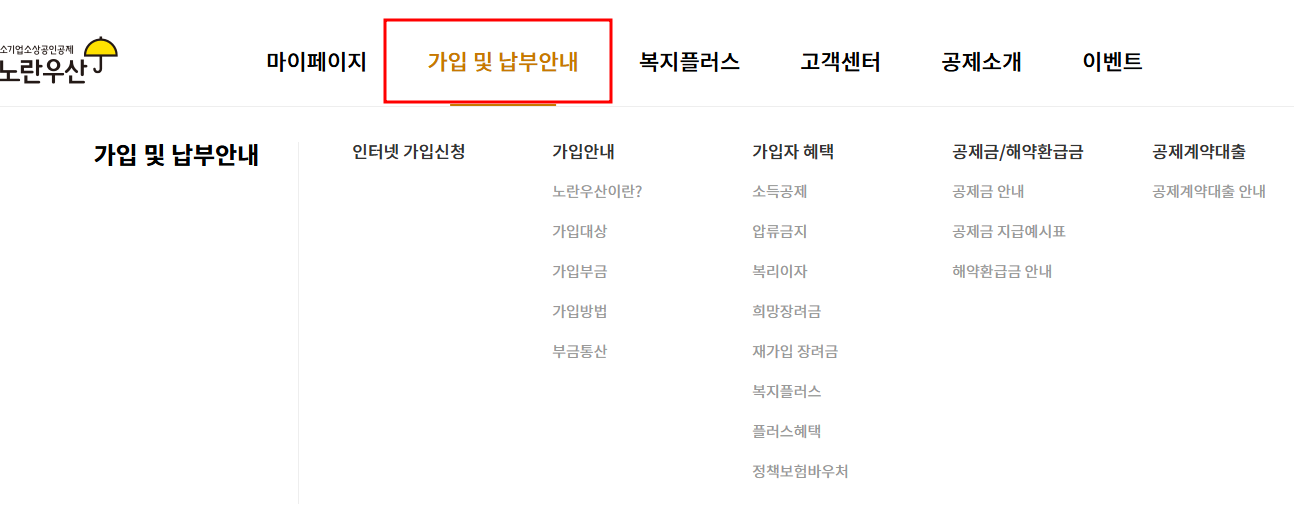2. 메뉴에서 가입 및 납부안내를 클릭합니다.