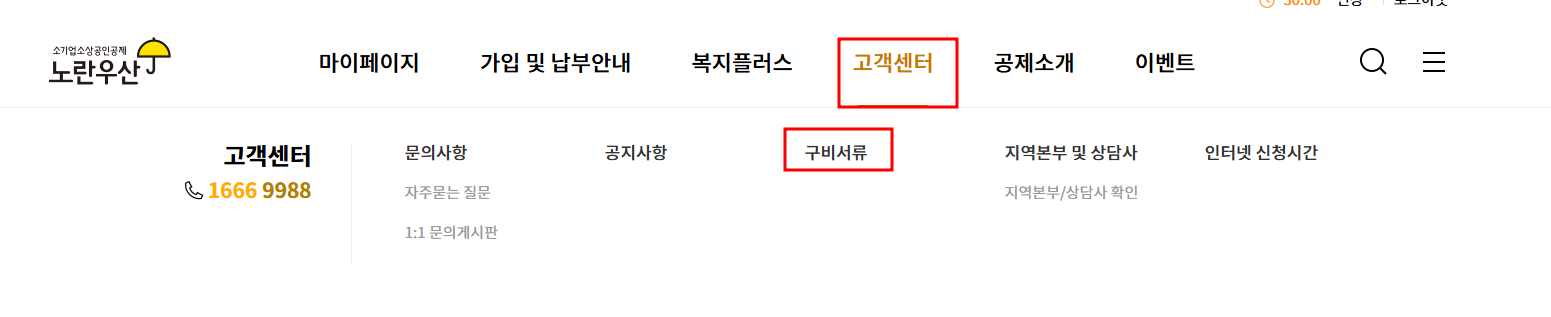 2. 메뉴에서 고객센터 -> 구비서류를 클릭합니다.