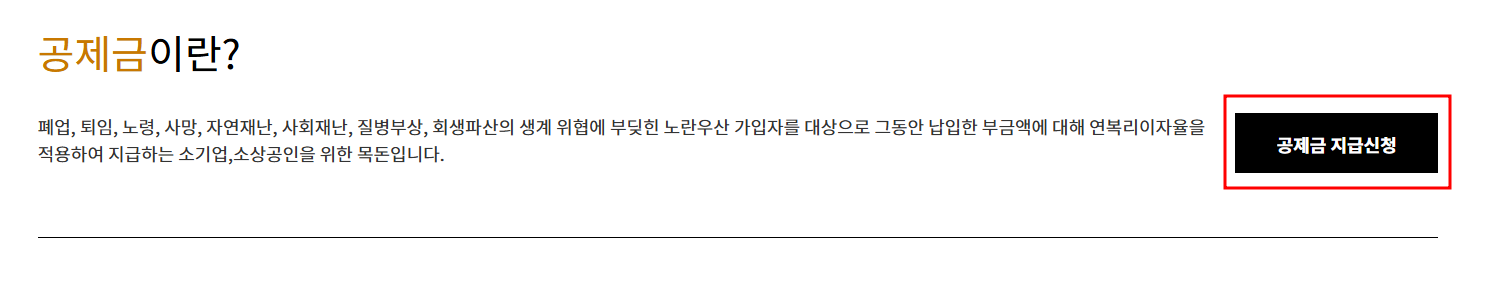 | 개인사업자의 폐업, 공동사업의 탈퇴 | - 법인대표의 질병 또는 부상으로 인한 퇴임 - 60세 이상으로 120회차 이상 부금 납부한 가입자의 공제금 지급 청구 - 재난 및 안전관리 기본법 제3조제1호가목에 따른 자연재난으로 영업이 불가능한 경우 - 재난 및 안전관리 기본법 제3조1호나목에 따른 사회재난 중 특별재난지역으로 선포된 지역의 사회재난으로 영업이 불가능한 경우 - 질병이나 부상으로 6개월 이상 요양을 필요로 하는 경우 - 채무자 회생 및 파산에 관한 법률에 따른 회생절차개시의 결정, 간이회생절차개시의 결정 또는 개인회생절차개시의 결정을 받은 경우 - 채무자 회생 및 파산에 관한 법률에 따라 파산선고를 받은 경우 |