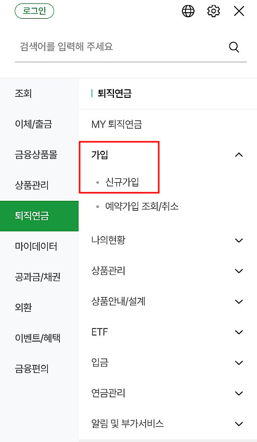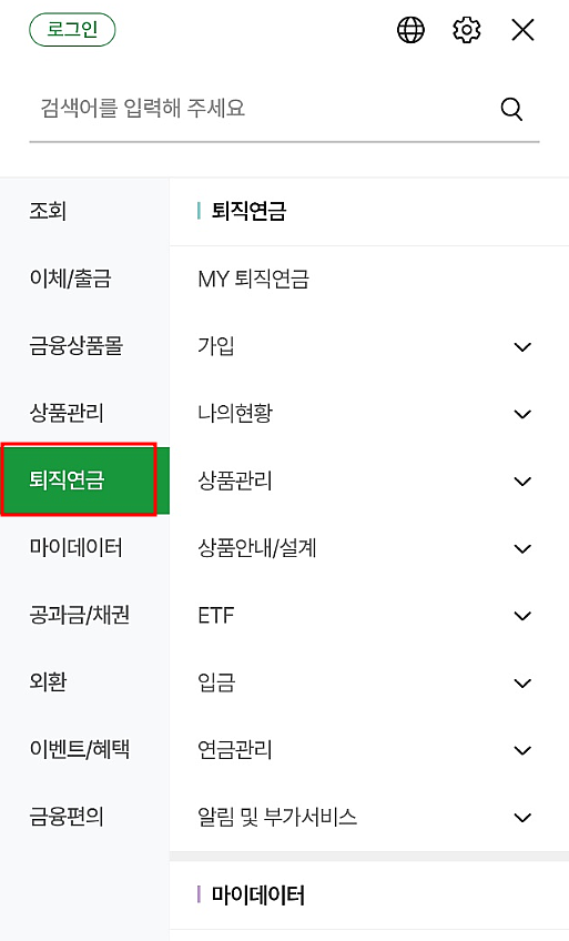 2. 메뉴에서 퇴직연금을 클릭합니다.