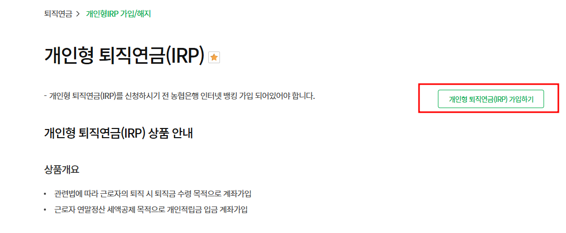 4. 개인형 퇴직연금(IRP) 가입하기를 클릭합니다.