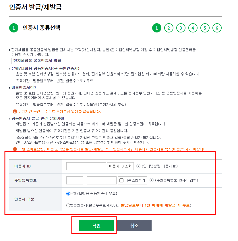 4. 인증서 종류 선택 후 확인을 클릭합니다.