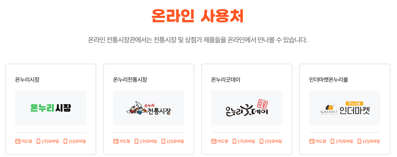 온라인에서 사용가능한 사이트는 온누리 디지털 상품권 홈페이지에서 확인할 수 있습니다.