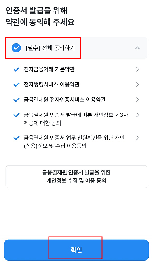 7. 전체 약관 동의 후 확인을 클릭합니다.