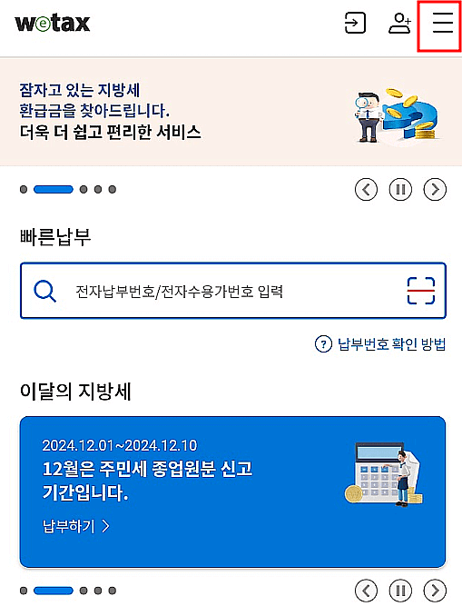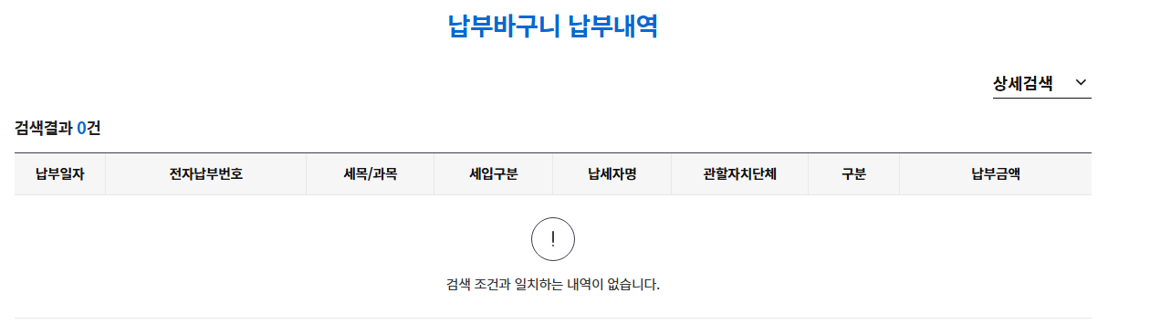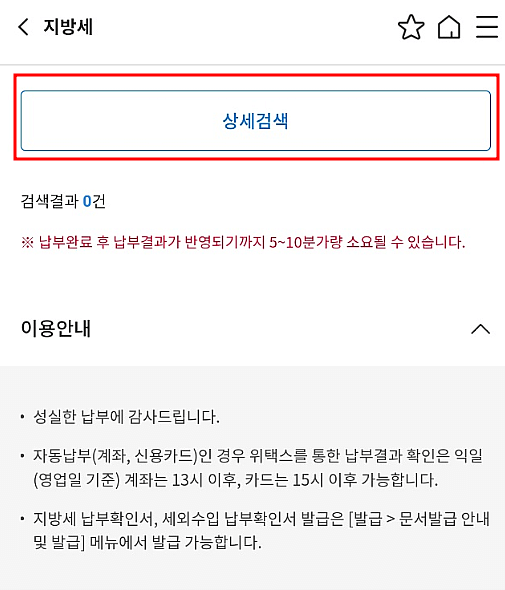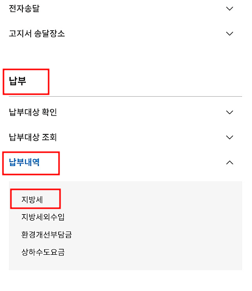 3. '납부' -> '납부내역' -> '지방세'를 클릭합니다.