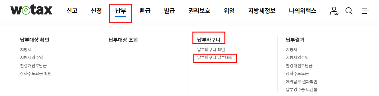 3. 메뉴에서 '납부' -> '납부바구니' -> '납부바구니 납부내역'을 클릭합니다.