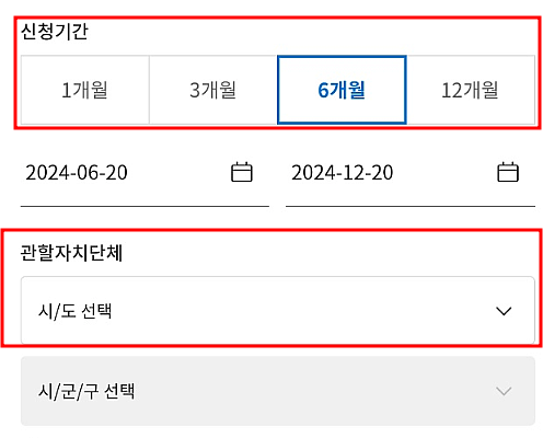 5. '신청기간' , '관할자치단체'를 골라줍니다.