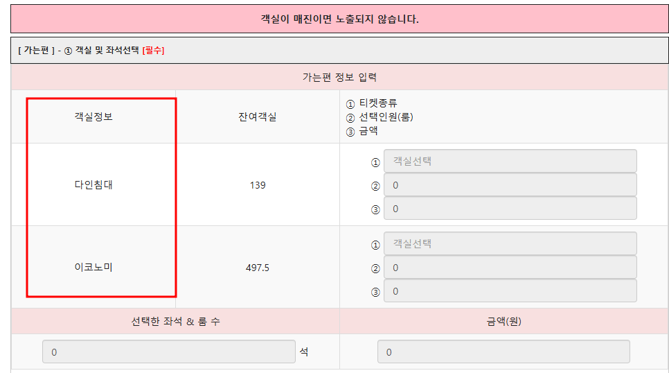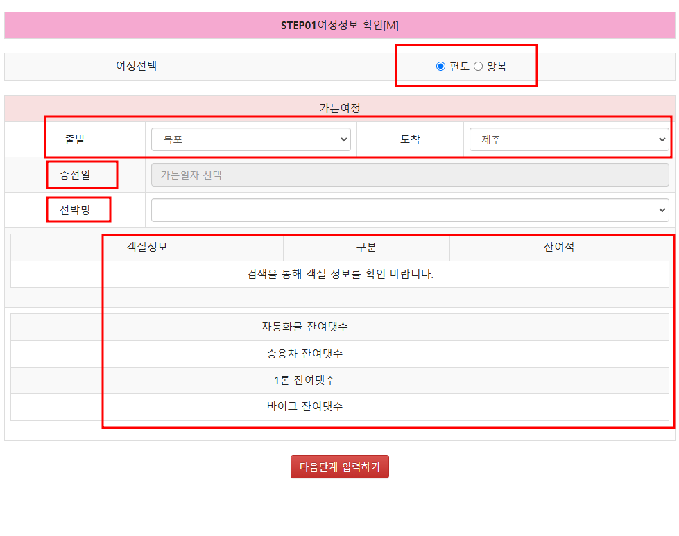 5. 출발지, 도착지, 승선일등 정보를 입력합니다.