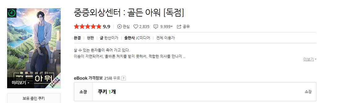 그리고 <중증외상센터 : 골든아워>는 드라마 방영전에 네이버 웹툰으로 연재되어 완결까지 난 상태입니다. 만약 소설이 부담스러운 분들이라면 네이버 웹툰으로 보는 걸 추천드립니다.