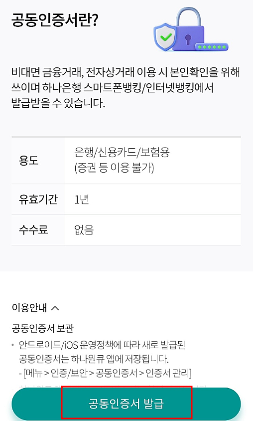 지금까지 PC, 모바일로 하나은행 공동인증서 발급받는 방법에 대해서 알아봤습니다. 한번 발급 받으면 1년동안 은행 업무 시 편하게 이용할 수 있으니, 위 방법을 통해 공동인증서를 발급 받는 걸 추천드립니다.