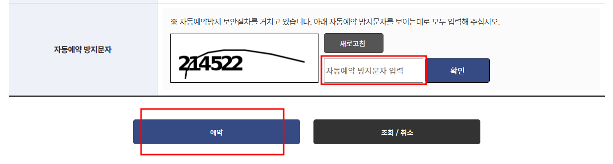 7. '자동예약 방지문자'를 입력하고 '예약'을 눌러주면 됩니다.
