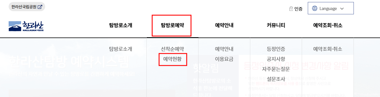 한라산 탐방 예약은 선착순이기 때문에 마감되면 예약이 불가능합니다. 그래서 예약하기 전에 예약현황을 먼저 체크해야 하는데요. 지금부터 예약현황 보는 방법을 알아보겠습니다.