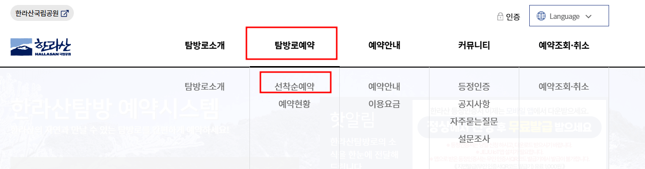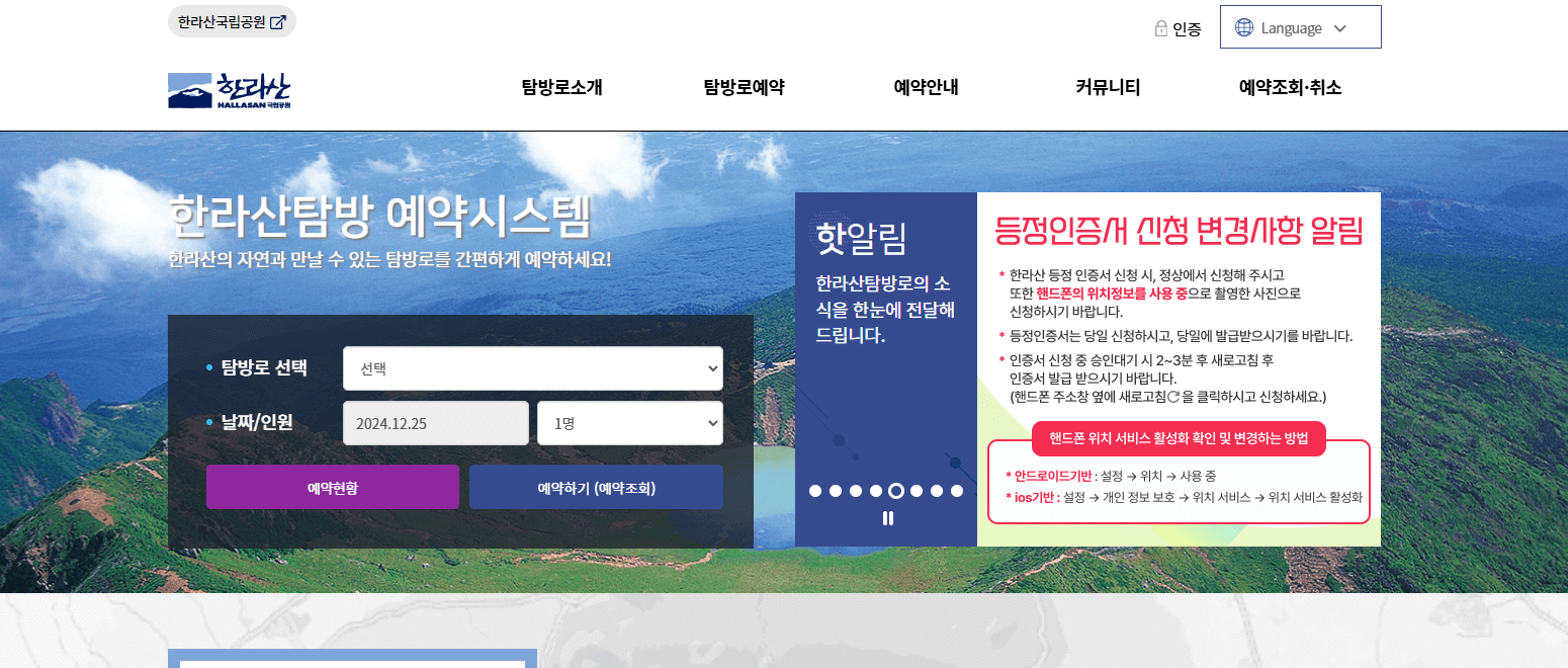 1. 한라산 탐방 예약시스템 홈페이지에 접속합니다.