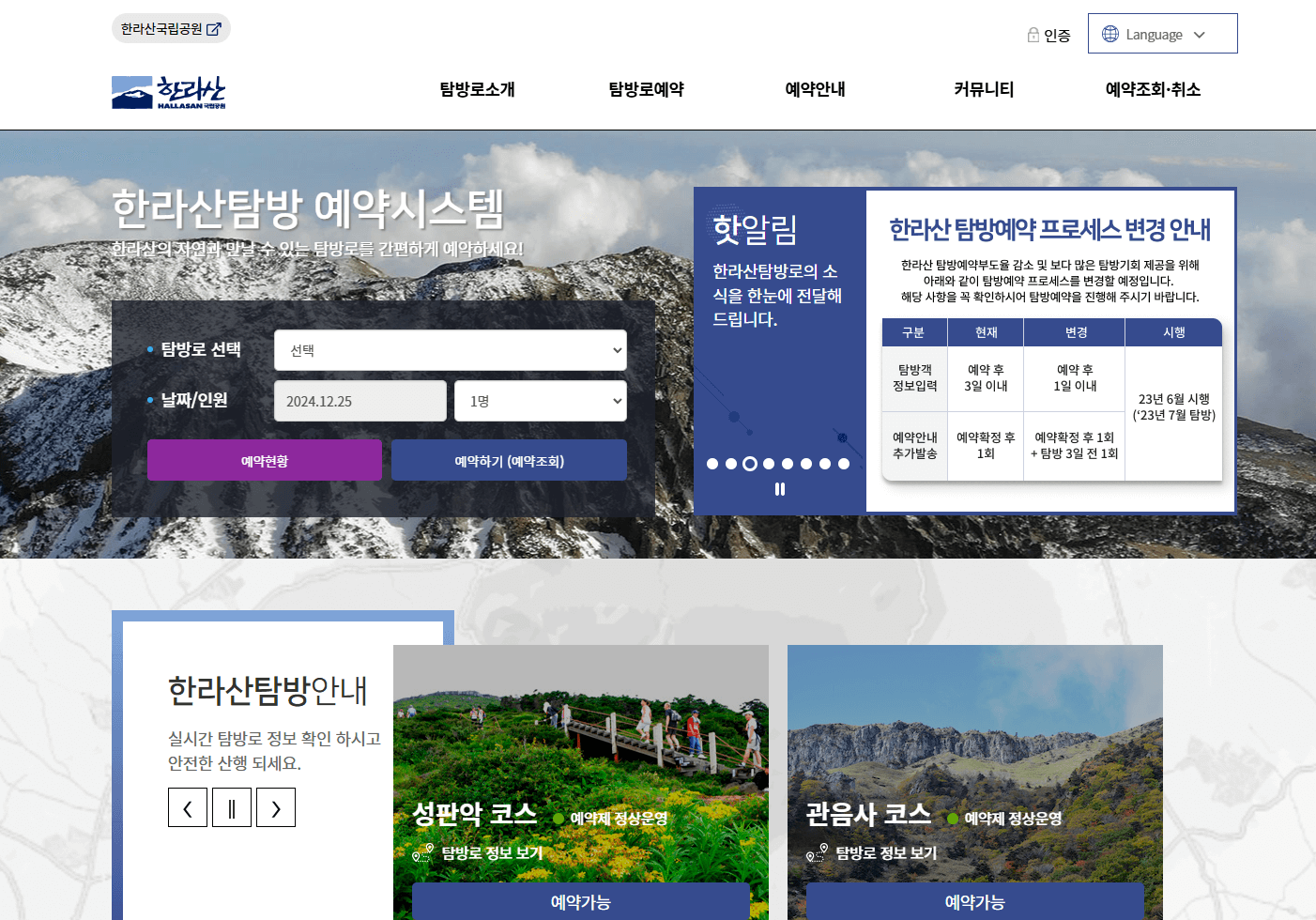 12~1월 한라산 탐방예약을 12월 27일까지 받고 있는데요. 선착순이기 때문에 예약하지 못하면 성판악, 관음사 코스를 탐방할 수 없습니다. 마감되기 전에 최대한 빨리 예약하세요.