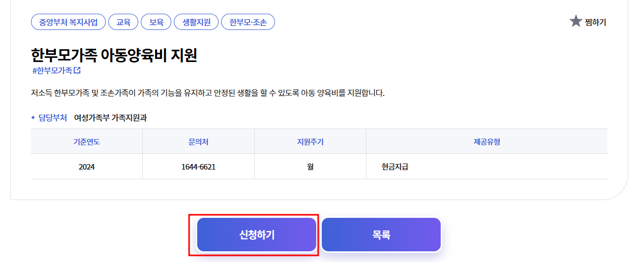 3. 한부모가족 지원 신청하기를 클릭합니다.