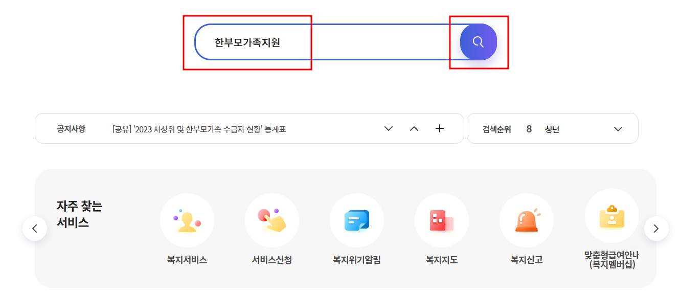 2. 로그인 후 한부모가족 지원을 검색합니다.