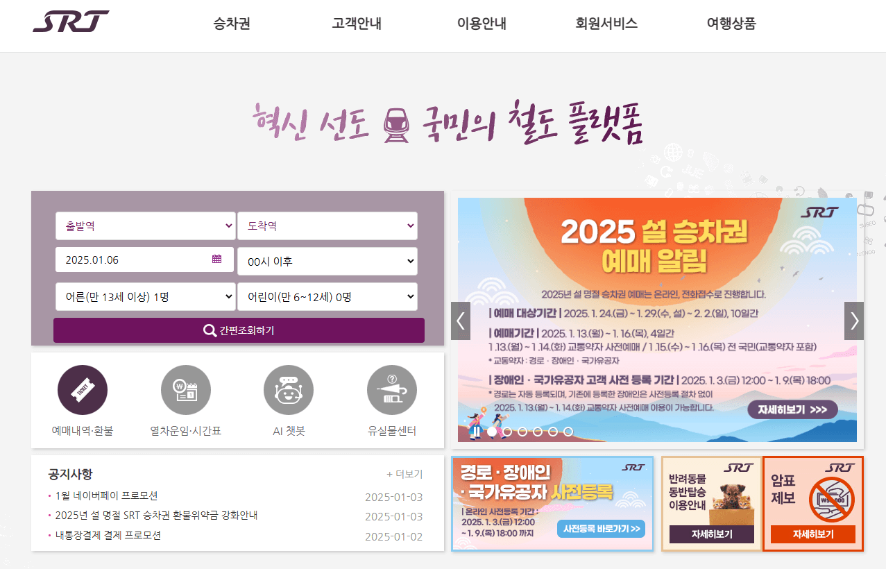 SRT 설날 기차표 또한 설 명절 예매 전용 홈페이지에서 예매가 가능합니다.